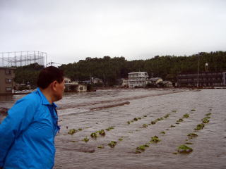 | 渋滞する託麻総合出張所横の市道 | 白川と区別がつかないタバコ畑 |