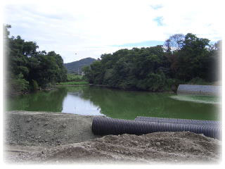 | 工事中の長嶺東ため池 | 完成した長嶺東ため池 | ||||||||||||||||||||||||||||